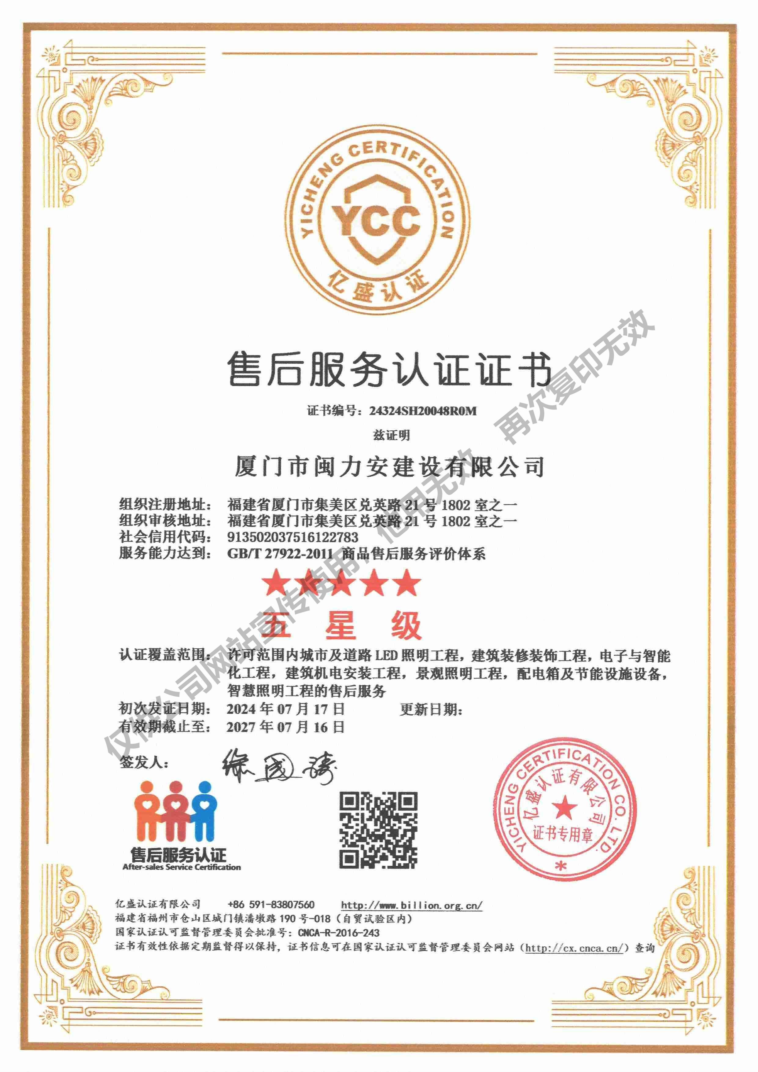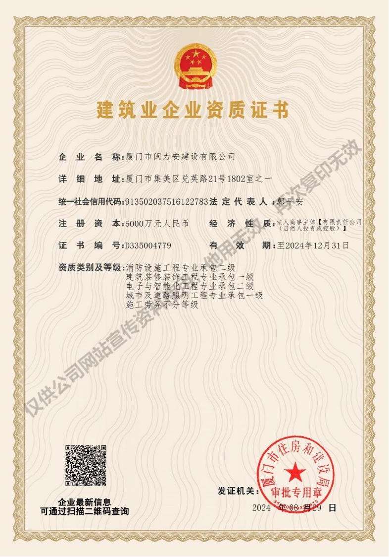廈門(mén)市閩力安建設(shè)有限公司成立于2003年,公司取得市政公用工程施工總承包貳級(jí)、建筑裝修裝飾工程專(zhuān)業(yè)承包壹級(jí)、城市及道路照明工程專(zhuān)業(yè)承包壹級(jí)、電子與智能化工程專(zhuān)業(yè)承包貳級(jí)、消防設(shè)施工程專(zhuān)業(yè)承包貳級(jí)、電力工程施工總承包叁級(jí)、建筑機(jī)電安裝工程專(zhuān)業(yè)承包叁級(jí)、輸變電工程專(zhuān)業(yè)承包叁級(jí)、環(huán)保工程專(zhuān)業(yè)承包叁級(jí)、照明工程設(shè)計(jì)專(zhuān)項(xiàng)甲級(jí)、建筑裝飾工程設(shè)計(jì)乙級(jí)、施工勞務(wù)等資質(zhì)的綜合型企業(yè),公司于2013年通過(guò)了ISO9001質(zhì)量體系認(rèn)證,ISO14001環(huán)境管理體系認(rèn)證,OHSAS18001職業(yè)健康安全管理體系認(rèn)證。