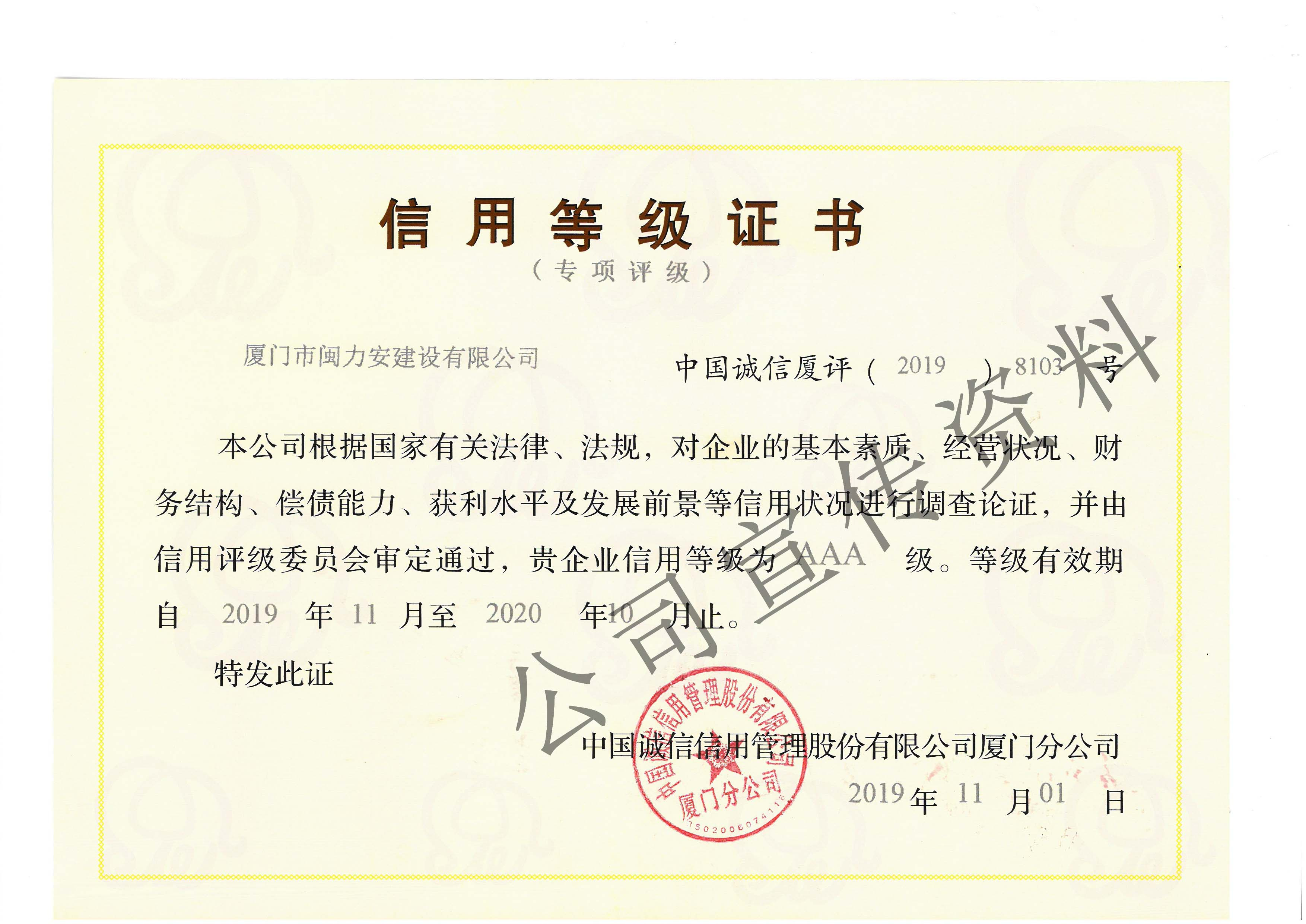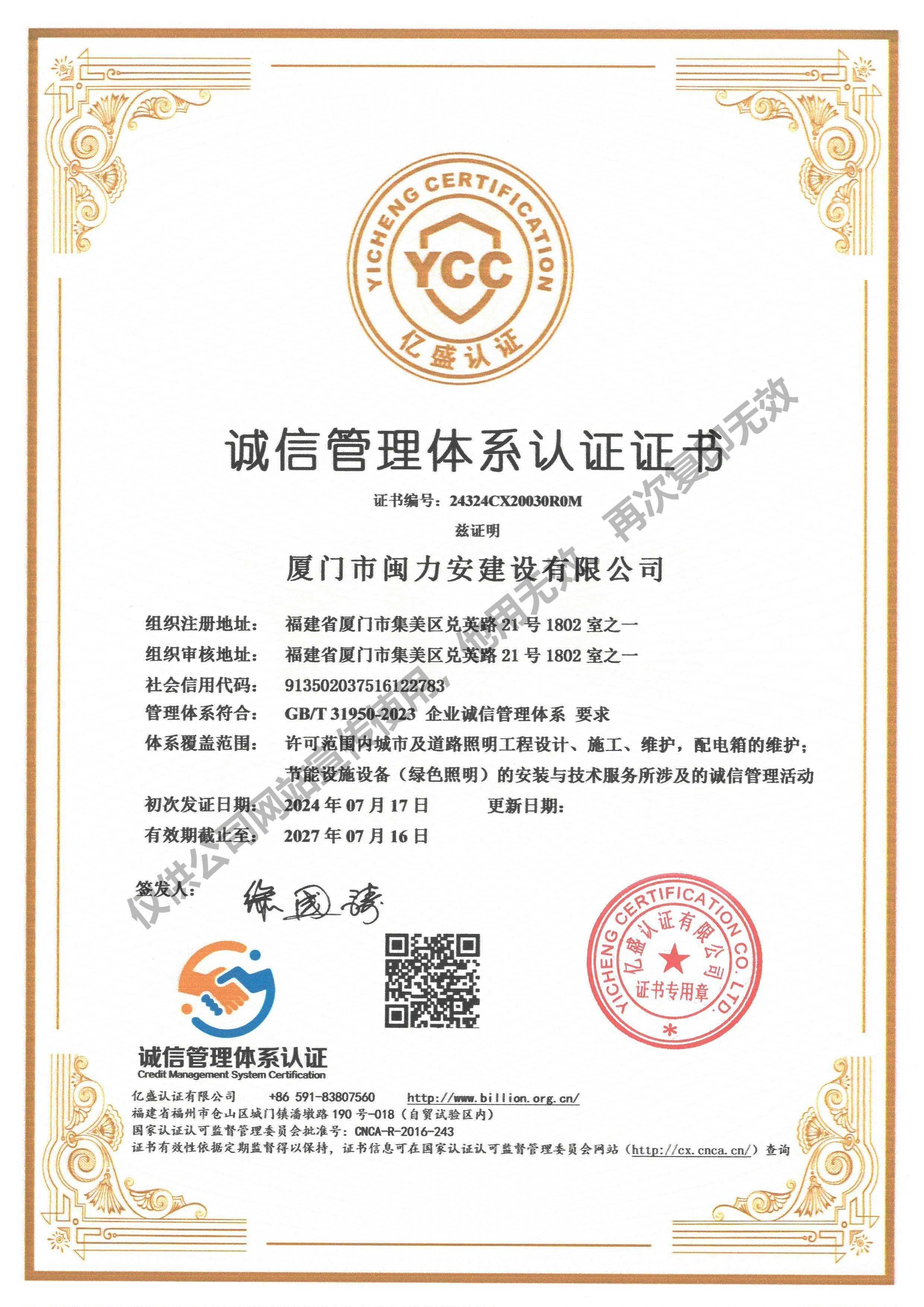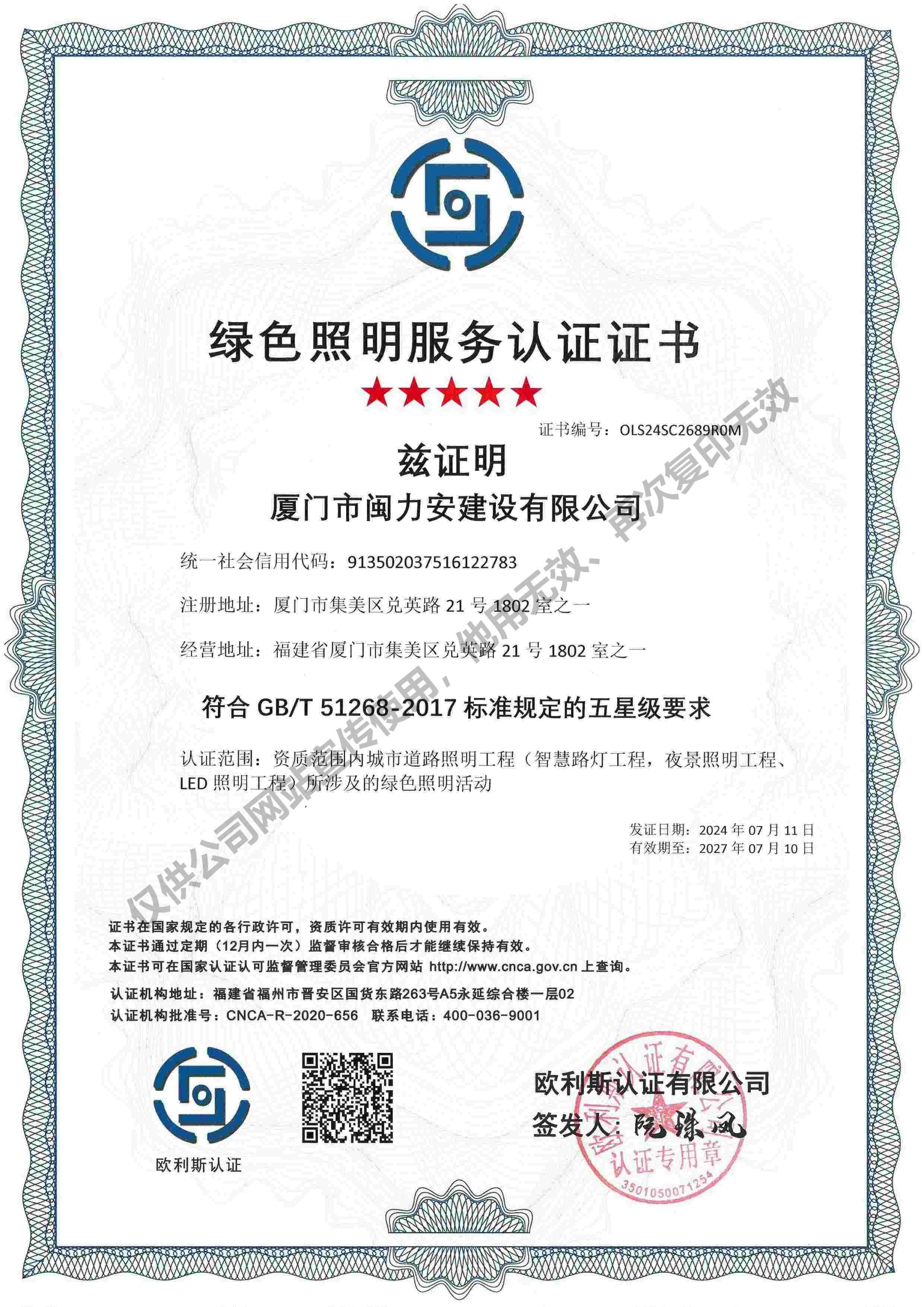 廈門(mén)市閩力安建設(shè)有限公司成立于2003年,公司取得市政公用工程施工總承包貳級(jí)、建筑裝修裝飾工程專(zhuān)業(yè)承包壹級(jí)、城市及道路照明工程專(zhuān)業(yè)承包壹級(jí)、電子與智能化工程專(zhuān)業(yè)承包貳級(jí)、消防設(shè)施工程專(zhuān)業(yè)承包貳級(jí)、電力工程施工總承包叁級(jí)、建筑機(jī)電安裝工程專(zhuān)業(yè)承包叁級(jí)、輸變電工程專(zhuān)業(yè)承包叁級(jí)、環(huán)保工程專(zhuān)業(yè)承包叁級(jí)、照明工程設(shè)計(jì)專(zhuān)項(xiàng)甲級(jí)、建筑裝飾工程設(shè)計(jì)乙級(jí)、施工勞務(wù)等資質(zhì)的綜合型企業(yè),公司于2013年通過(guò)了ISO9001質(zhì)量體系認(rèn)證,ISO14001環(huán)境管理體系認(rèn)證,OHSAS18001職業(yè)健康安全管理體系認(rèn)證。