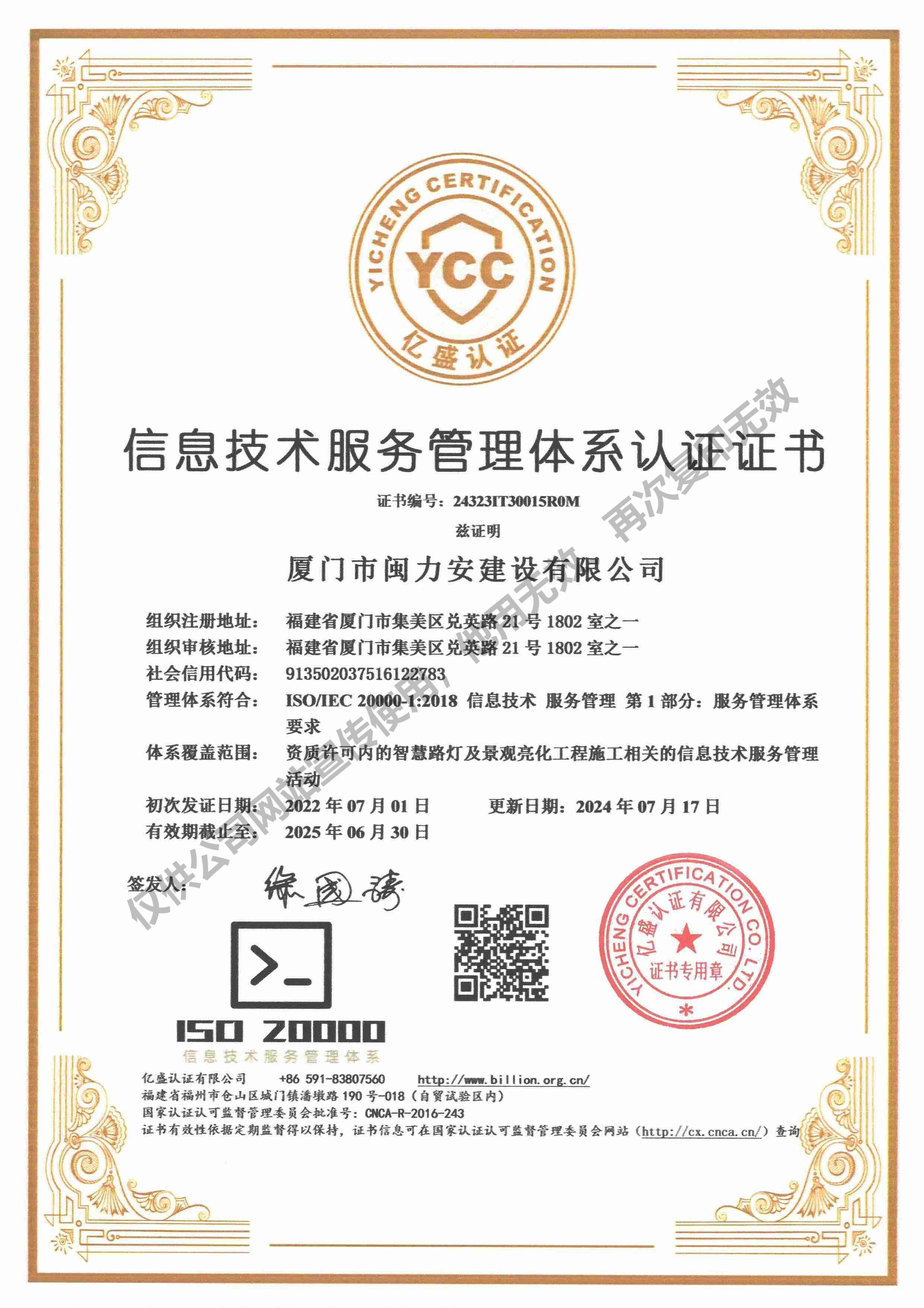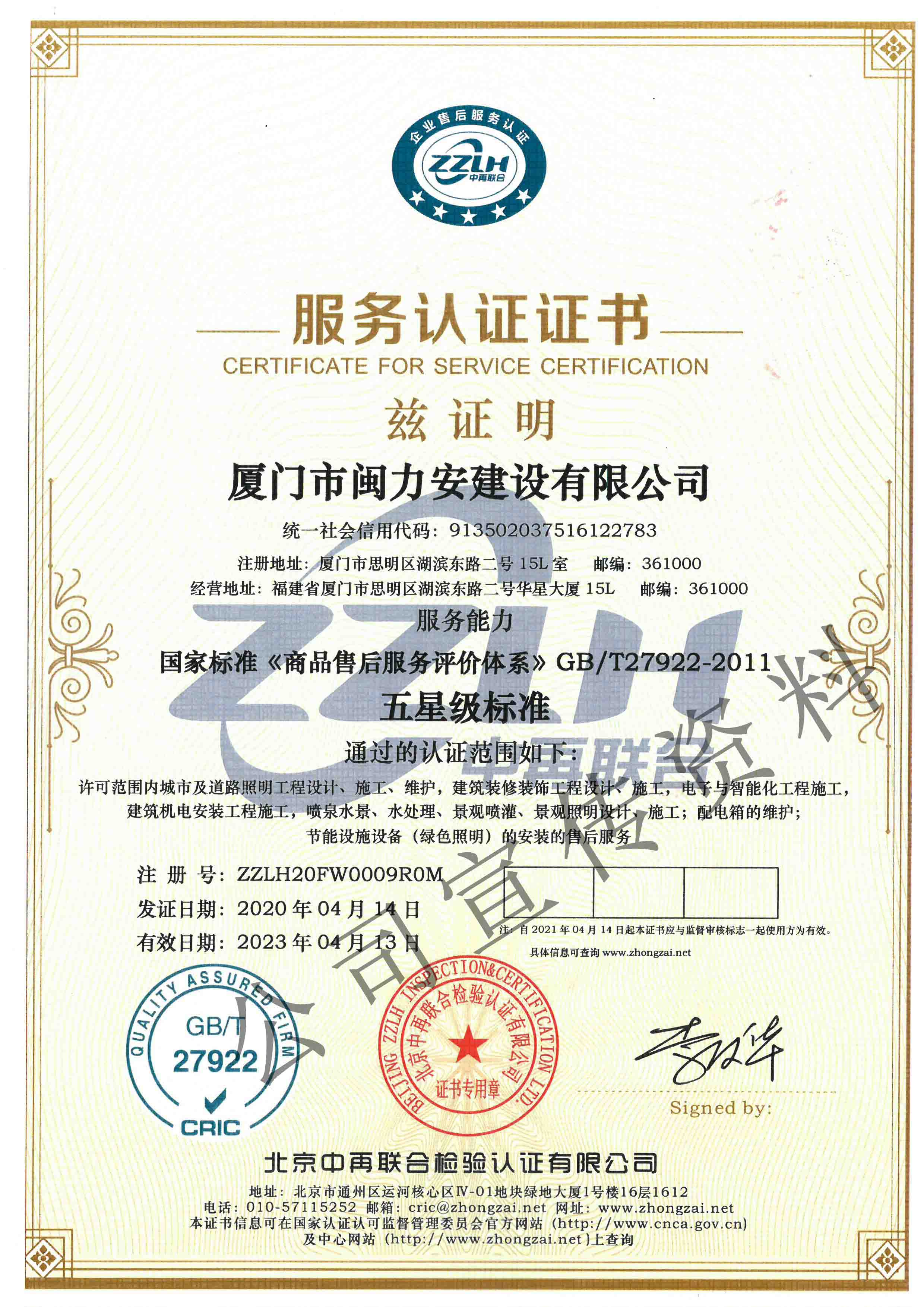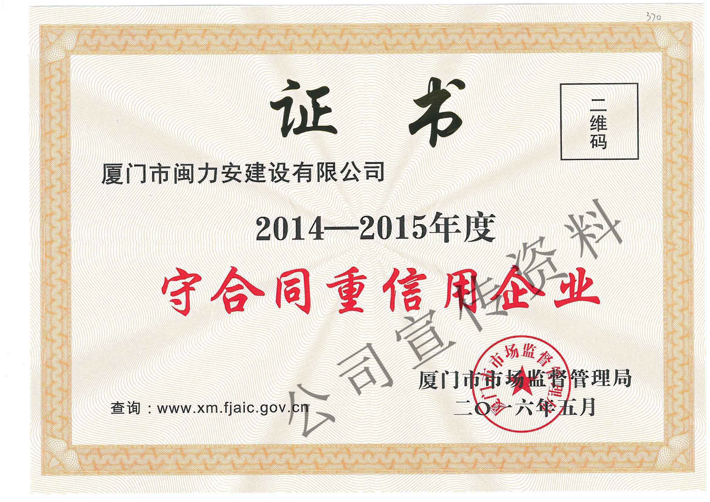 廈門(mén)市閩力安建設(shè)有限公司成立于2003年,公司取得市政公用工程施工總承包貳級(jí)、建筑裝修裝飾工程專(zhuān)業(yè)承包壹級(jí)、城市及道路照明工程專(zhuān)業(yè)承包壹級(jí)、電子與智能化工程專(zhuān)業(yè)承包貳級(jí)、消防設(shè)施工程專(zhuān)業(yè)承包貳級(jí)、電力工程施工總承包叁級(jí)、建筑機(jī)電安裝工程專(zhuān)業(yè)承包叁級(jí)、輸變電工程專(zhuān)業(yè)承包叁級(jí)、環(huán)保工程專(zhuān)業(yè)承包叁級(jí)、照明工程設(shè)計(jì)專(zhuān)項(xiàng)甲級(jí)、建筑裝飾工程設(shè)計(jì)乙級(jí)、施工勞務(wù)等資質(zhì)的綜合型企業(yè),公司于2013年通過(guò)了ISO9001質(zhì)量體系認(rèn)證,ISO14001環(huán)境管理體系認(rèn)證,OHSAS18001職業(yè)健康安全管理體系認(rèn)證。